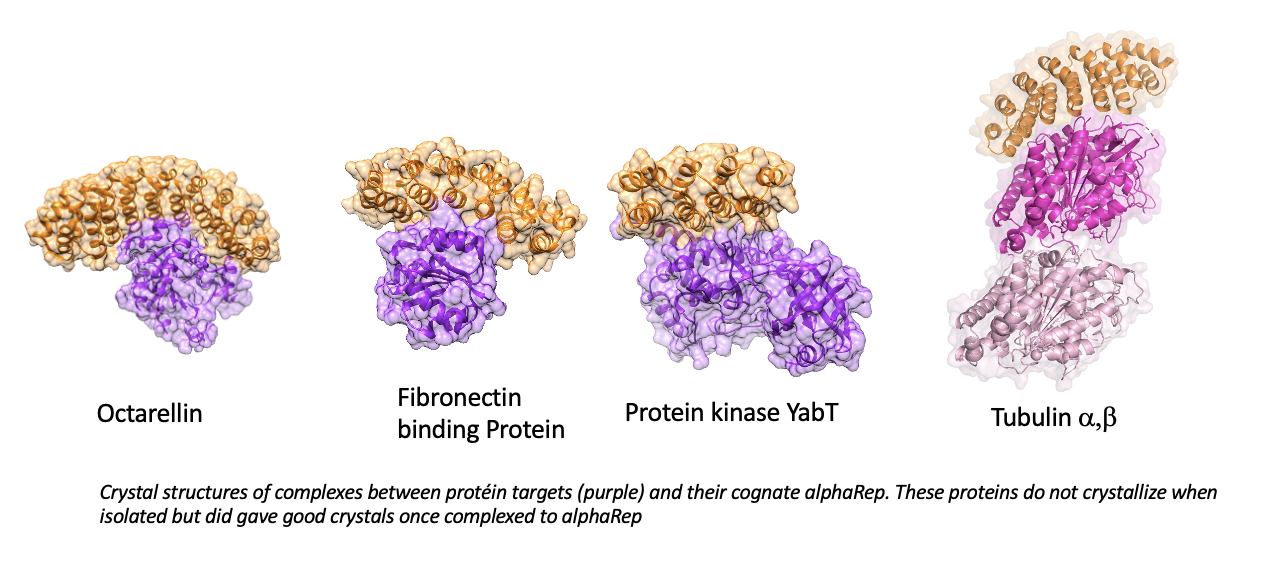 We have designed and assembled a large library of artificial repeats proteins named alphaRep (1). alphaRep proteins binding tightly and specifically any predefined folded protein can be selected out from this library (2) AlphaRep generation does not require animal immunization and gives rise to renewable, sequence defined, binders. Specific alphaReps are soluble, efficiently produced, disulfide-free and extremely stable. Upon binding, alphaRep can stabilize their specific partners, and provide a large external surface able to generate intermolecular contacts, and favor crystallization (3). Crystal structures of complexes between proteins and their cognate alphaRep have been obtained including for proteins difficult to crystallize when isolated (4). AlphaRep could also be efficiently used for electron microscopy and as specific recognition unit for cellular applications like targeted protein degradation (PROTAC) (5).